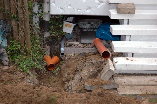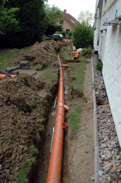 Die Hausentwässerung wurde schräg durch die Außenwand nach draußen geführt. Die neue Leitung konnte das Abwasser der Waschmaschinen gleich mit aufnehmen. So konnten alle alten Kellerabflüsse ebenfalls verschlossen werden.
