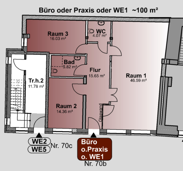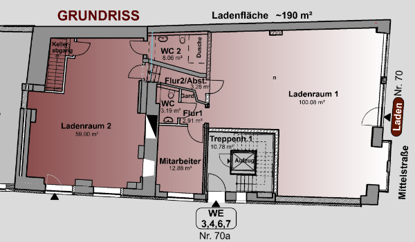 Die Aufteilung der Ladenlokale ist noch veränderbar. So besteht die Möglichkeit die Läden und die Praxis einzeln anzumieten, Laden 1 und 2 mit 190 qm oder Laden 1, 2 und die Büro / Praxis mit 290 qm anzumieten.