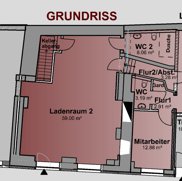 Bei der der Ladenfläche 2 stehen 68 qm im Erdgeschoss und 59 qm des Eventkellers zur Verfügung, die Kaltmiete beträgt 2.000,-- EUR netto zzgl. der gültigen Mehrwertsteuer.