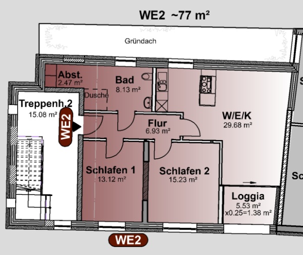 Die Wohnung 2 liegt im Obergeschoss, hat eine Wohnfläche von 77 qm, die Kaltmiete beträgt 730,-- EUR, die Nebenkosten werden bei 185,-- EUR liegen.