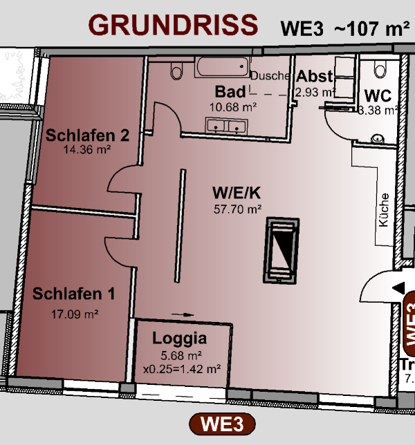 Die Wohnung 3 liegt auch im Obergeschoss, hat eine Wohnfläche von 107 qm, die Kaltmiete beträgt 1015,-- EUR, die Nebenkosten werden bei 255,-- EUR liegen.