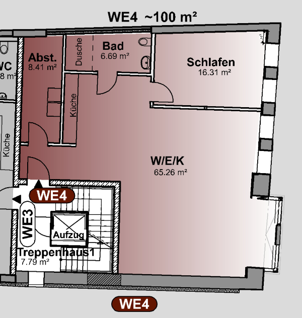 Die Wohnung 4 liegt auch im Obergeschoss, hat eine Wohnfläche von 100 qm, ist mit einem Aufzug zu erreichen, die Kaltmiete beträgt 1050,-- EUR, die Nebenkosten werden bei 240,-- EUR liegen.