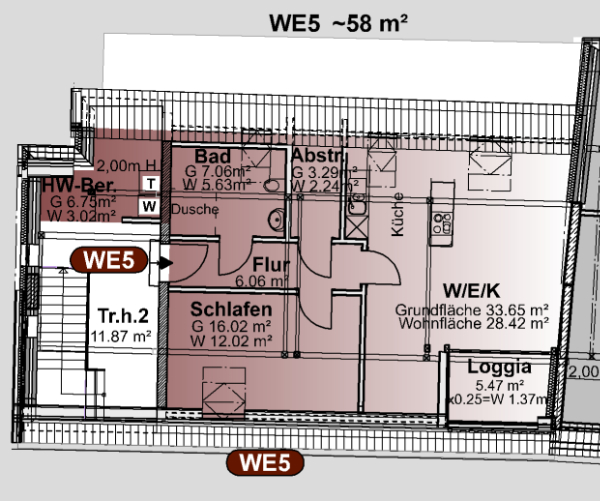 Die Wohnung 5 liegt im Dachgeschoss, besitzt eine Loggia und eine Galerie, hat eine Wohnfläche von 58 qm, die Kaltmiete beträgt 610,-- EUR, die Nebenkosten werden bei 150,-- EUR liegen.
