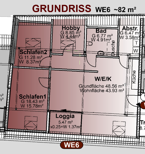 Die Wohnung 6 liegt auch im Dachgeschoss, besitzt eine Loggia und eine Galerie, hat eine Wohnfläche von 82 qm, die Kaltmiete beträgt 861,-- EUR, die Nebenkosten werden bei 195,-- EUR liegen.