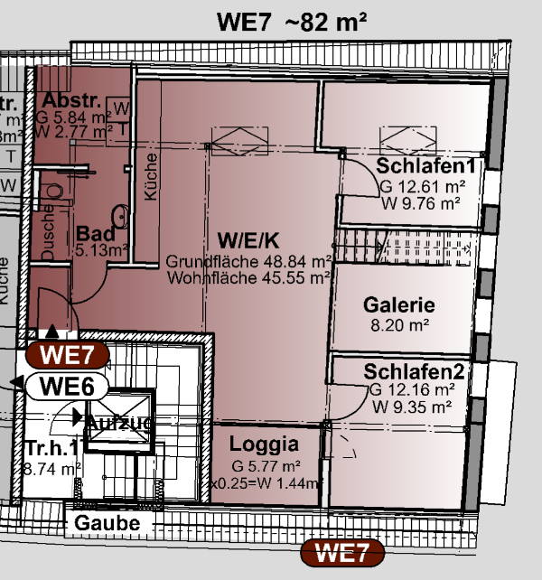 Die Wohnung 7 liegt auch im Dachgeschoss, besitzt eine Loggia und eine Galerie, hat eine Wohnfläche von 82 qm, die Kaltmiete beträgt 861,-- EUR, die Nebenkosten werden bei 195,-- EUR liegen.