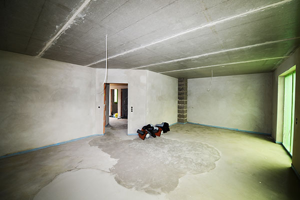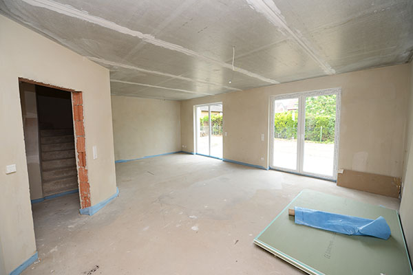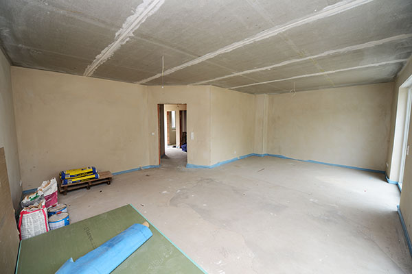 Das Wohnzimmer; Estricht und Putz sind fertig.